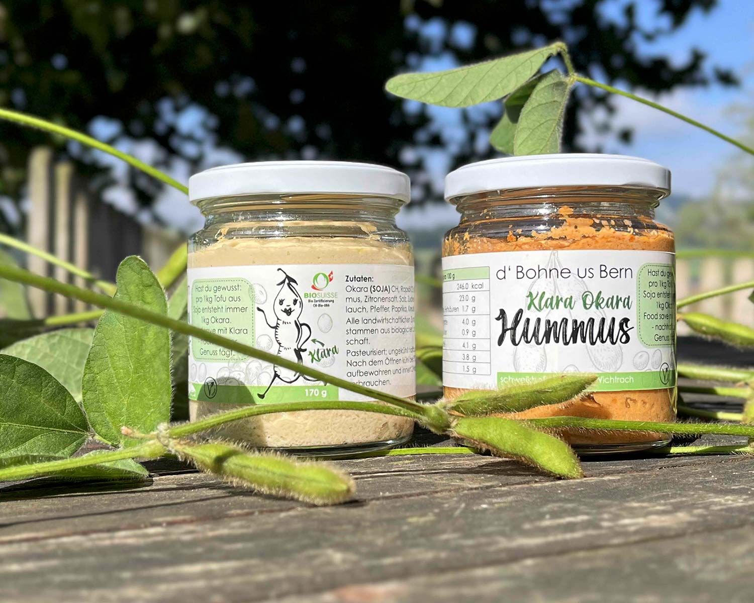 Okara ist ein geschmacksneutrales Nebenprodukt, das bei der Herstellung von Sojamilch oder Tofu entsteht. Interessanterweise fällt pro Kilogramm Tofu auch ein Kilogramm Okara an. Stefanie und Matthias Gfeller vom Schweikhof in Wichtrach nutzen dieses wertvolle Produkt, um daraus Hummus Nature, Hummus Tomaten & Chili und eine kreative Guacamole-Alternative namens «Tschüss Avocado» herzustellen. So wird die ganze Sojabohne nachhaltig verwertet.