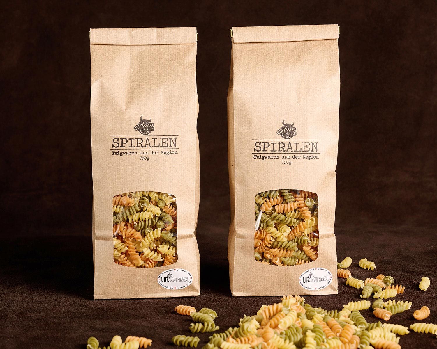 Die farbigen UrDinkel-Spiralen sind genial. Einerseits als Farbtupfer auf dem Teller, anderseits als ein weiteres Produkt in der stets wachsenden Palette der aareguet.ch Produkte.